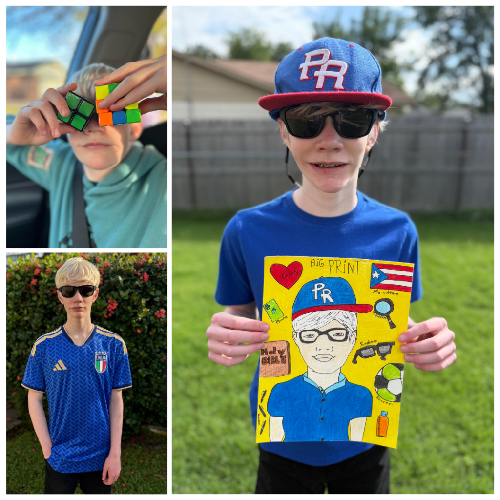 I visually access my hobbies just by having fun and practicing to get better. I love playing soccer and When I play I don’t really have special tricks I just work hard and I do my very best. I wear sunglasses and a cap to help with the brightness.