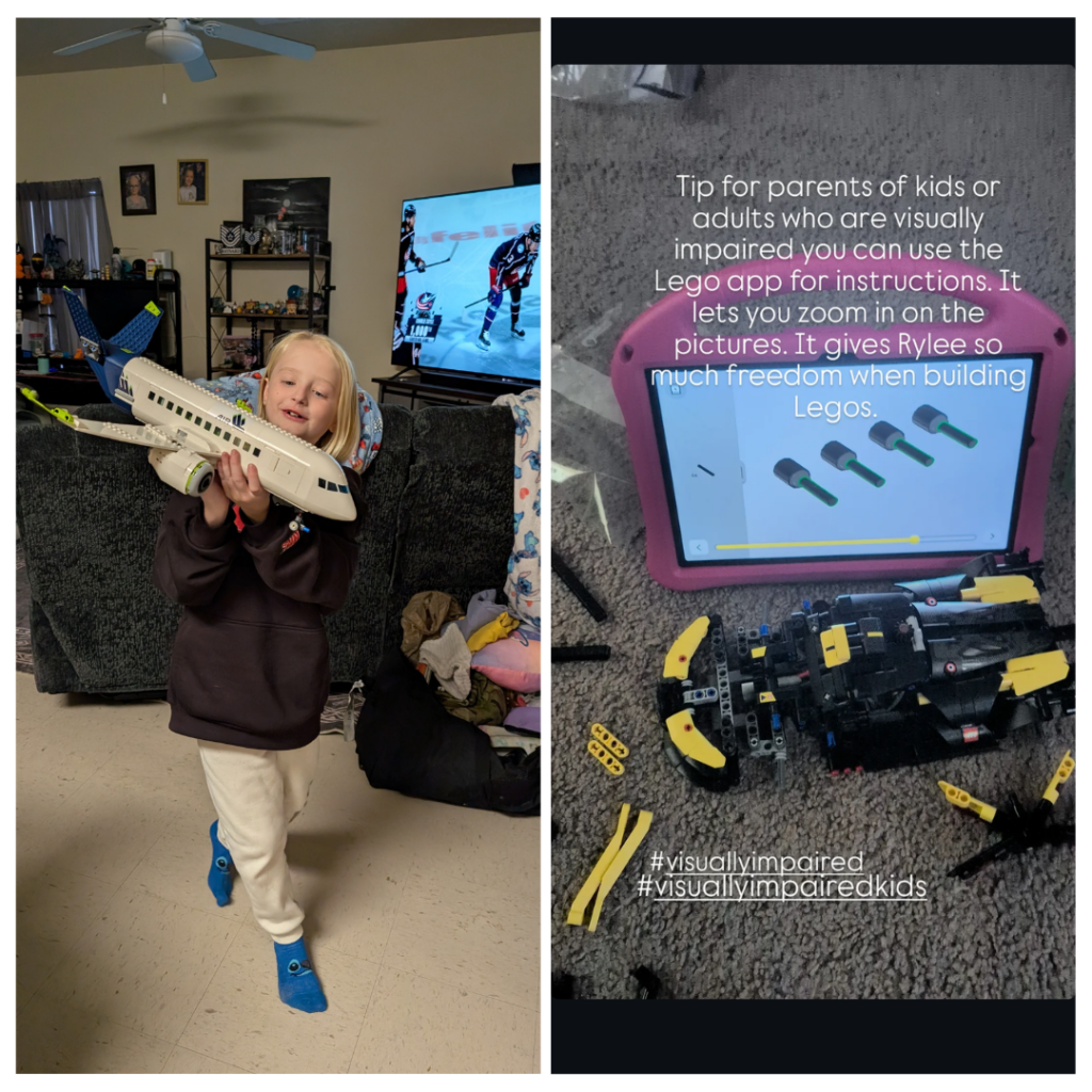 Photo caption: Tip for parents of kids or adults who are visually impaired you can use the Lego app fro instructions. It lets you zoom in on the pictures. It gives Rylee so much freedom when building Legos. #visuallyimpaired #visuallyimpairedkids