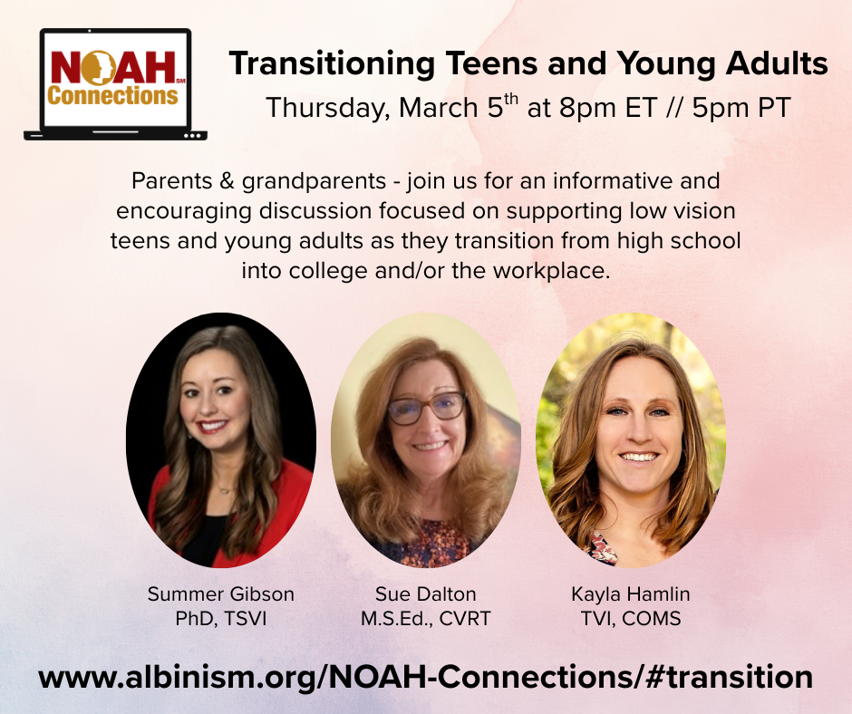 Parents & grandparents – join us for an informative and encouraging Zoom discussion focused on supporting low vision teens and young adults as they transition from high school into college and/or the workplace. This session will explore practical strategies, resources, and accommodations that help students and young adults build independence, advocate for themselves, and navigate new academic or professional environments with confidence.