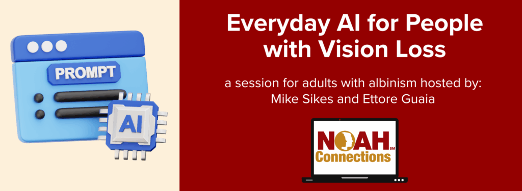 Join Mike and Ettore as they give you an introduction to AI and how to use it in our daily life as people with low vision. This call is open to all adults with albinism!