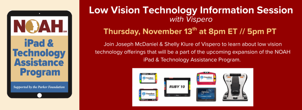 Join Joseph McDaniel & Shelly Klure of Vispero to learn about low vision technology offerings that will be a part of the upcoming expansion of the NOAH iPad & Technology Assistance Program.